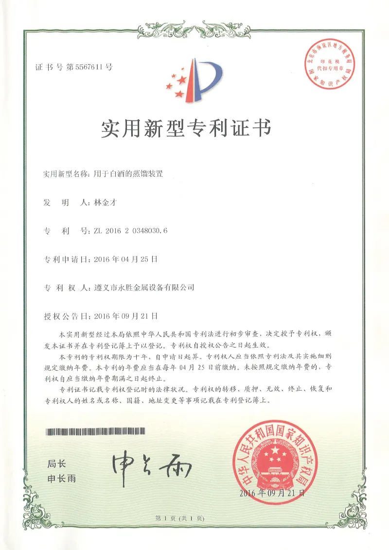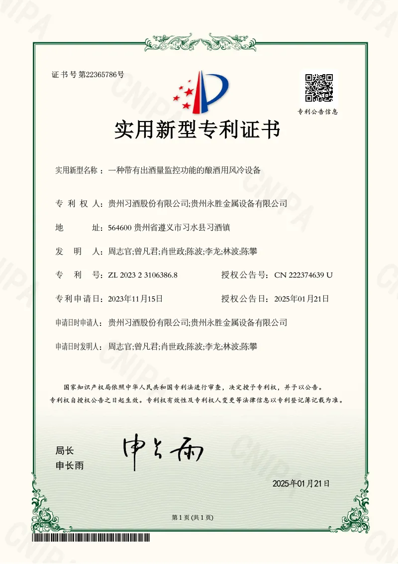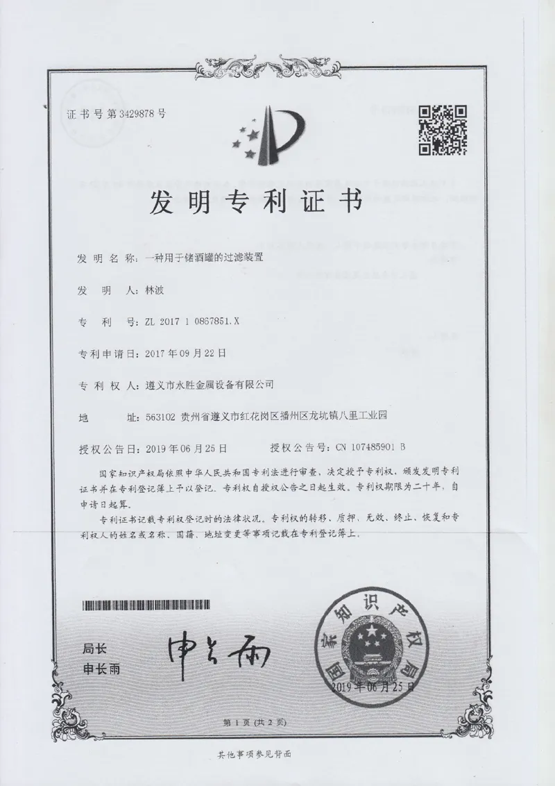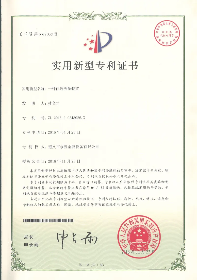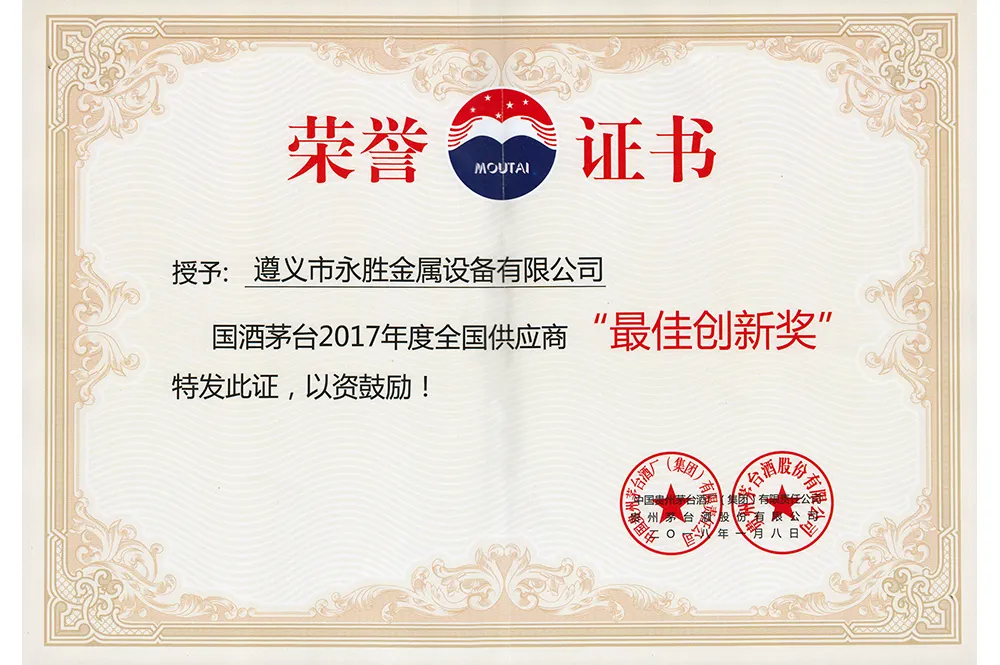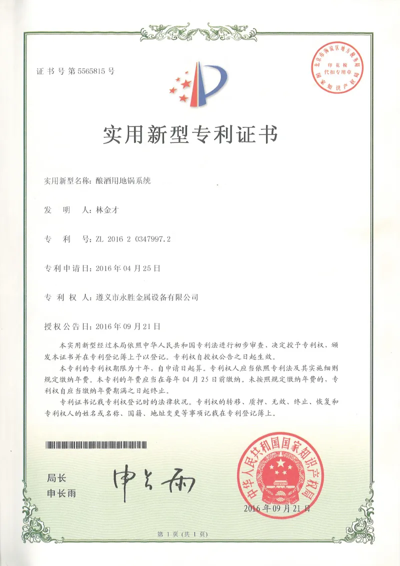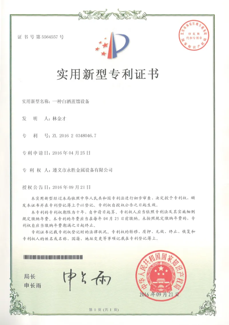 Компания получила в общей сложности 38 национальных патентов Китая, инициировала разработку ряда отраслевых технических стандартов, а также имеет лицензию на производство специального оборудования Китая, сертификат квалификации предприятия строительной отрасли, лицензию на безопасное производство, национальную лицензию на производство промышленной продукции, сертификат кредитного рейтинга уровня 3А и полный набор сертификатов шести систем: системы менеджмента качества ISO9001, послепродажного обслуживания, профессиональной безопасности и гигиены труда, экологического менеджмента, менеджмента безопасности пищевых продуктов и менеджмента интеллектуальной собственности. Показатель сдачи продукции с первого предъявления в течение 10 лет подряд сохраняется на уровне выше 99,5%. Компания является долгосрочным партнером ведущих китайских производителей спиртных напитков, таких как Маотай, Сзюцзю, Ланцзю, и была удостоена наград Маотай «Лучшая инновационная премия» и «Лучший поставщик», Сзюцзю «Лучший партнер» и Ланцзю «Стратегический поставщик».