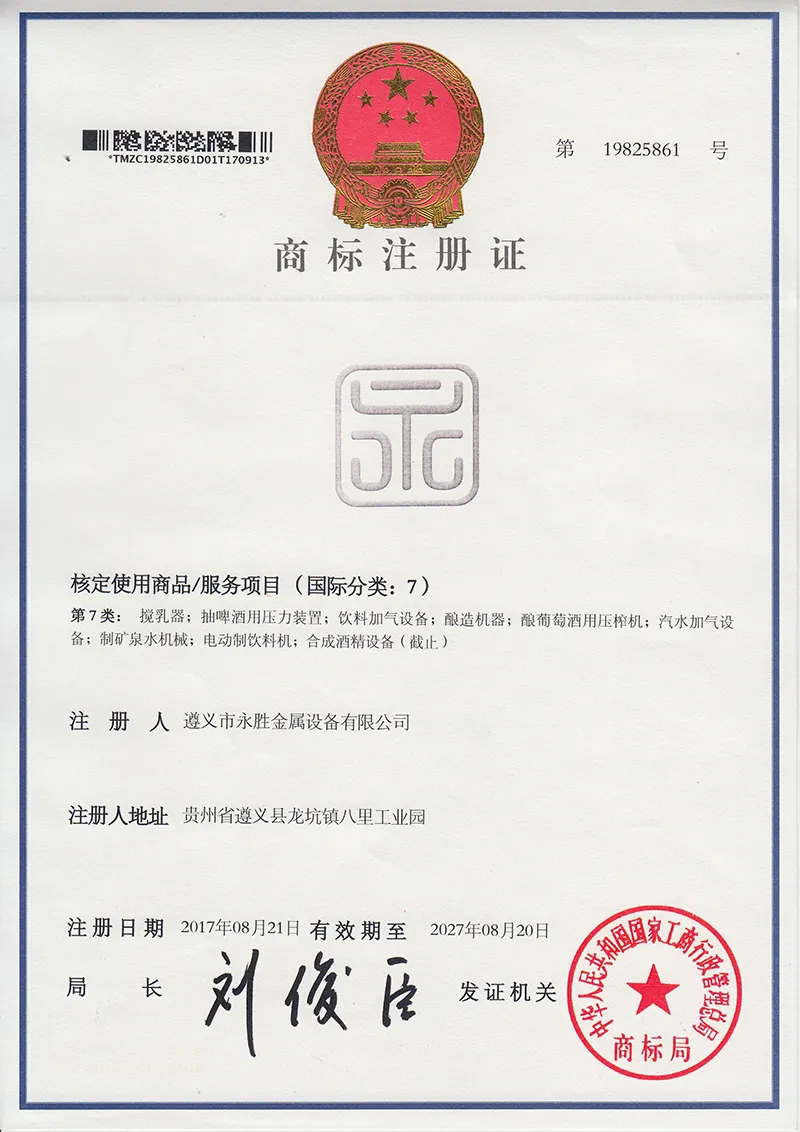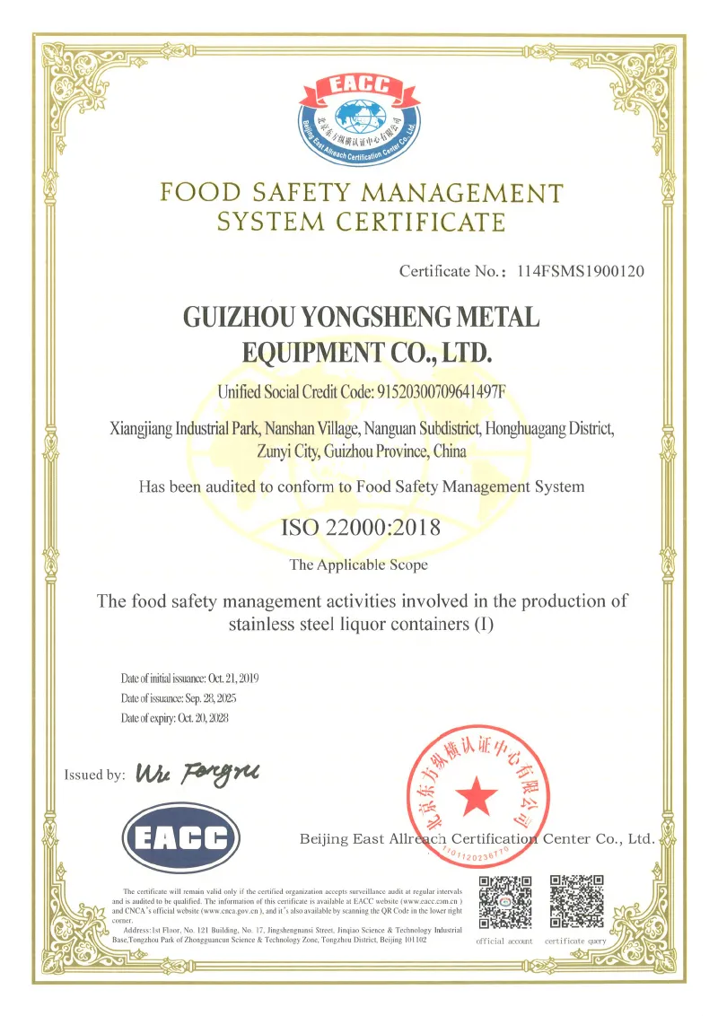 ООО Гуйчжоу Юншэн Металлическое Оборудование было основано в 1999 году и расположено в городе Цзуньи, родном месте знаменитого китайского спиртного напитка Маотай — провинции Гуйчжоу. Компания является китайским высокотехнологичным предприятием, предприятием, специализирующимся на производстве высокотехнологичной продукции, и первым в Китае производственным предприятием, разработавшим и зарегистрировавшим корпоративный стандарт на оборудование для винокурения.